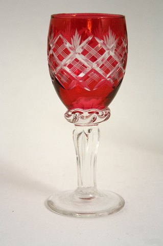 Krystalglas med rød kumme og slibninger, samt slebet stilk. Højde 12 cm. Pris: SOLGT
