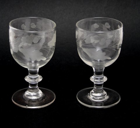 Holmegaard glasværk m.fl, Egeløvglas fra 1853 kataloget. 4 syvfligede fjerlappede blade, der peger med spids skiftevis opad og nedad. 2 ager placeret skiftevis over og under hvert blad. Knækket i bund. Højde 10,5 og 10,7 cm. Pæn og hel stand. Pris: SOLGT