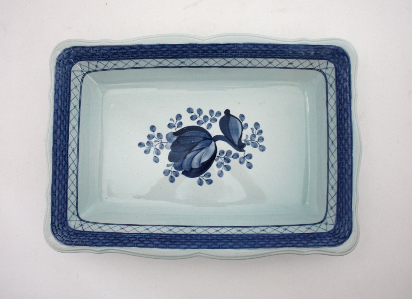 Aluminia, Tranquebar lyseblå fajance med mørkeblå tulipan og flettet bort designet af Christian Joachim. Produceret fra 1914 til 1969, hvor det overgik til Royal Copenhagen. Håndmalet.