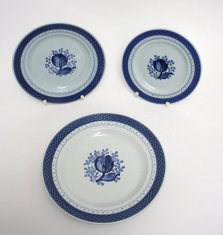 Aluminia, Tranquebar lyseblå fajance med mørkeblå tulipan og flettet bort designet af Christian Joachim. Produceret fra 1914 til 1969, hvor det overgik til Royal Copenhagen. Håndmalet. Flot stand. Enkelte med lettere overfladekrakelering.