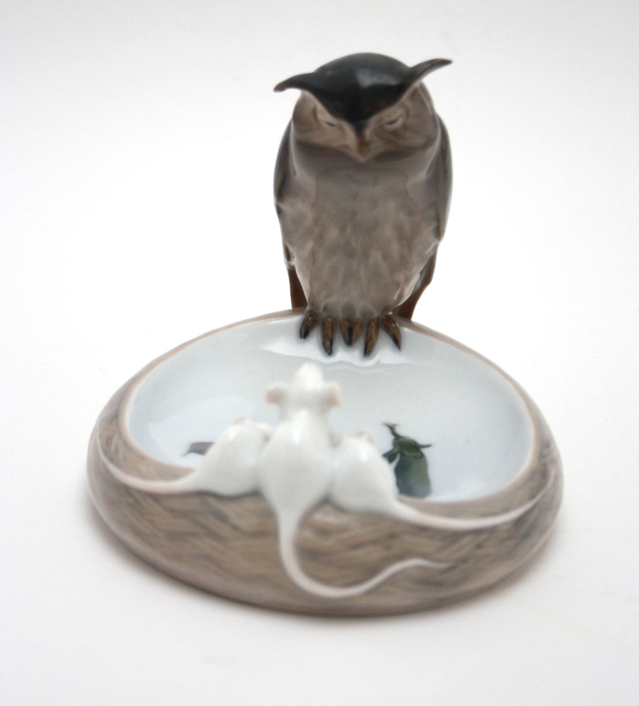Royal Copenhagen, Ugle og tre mus på fad/skål. Designet af Chr. Thomsen i 1904. Højde 13 cm. Længde 14,5 cm. Der er afslag på det ene museøre. I. sortering. Pris: SOLGT