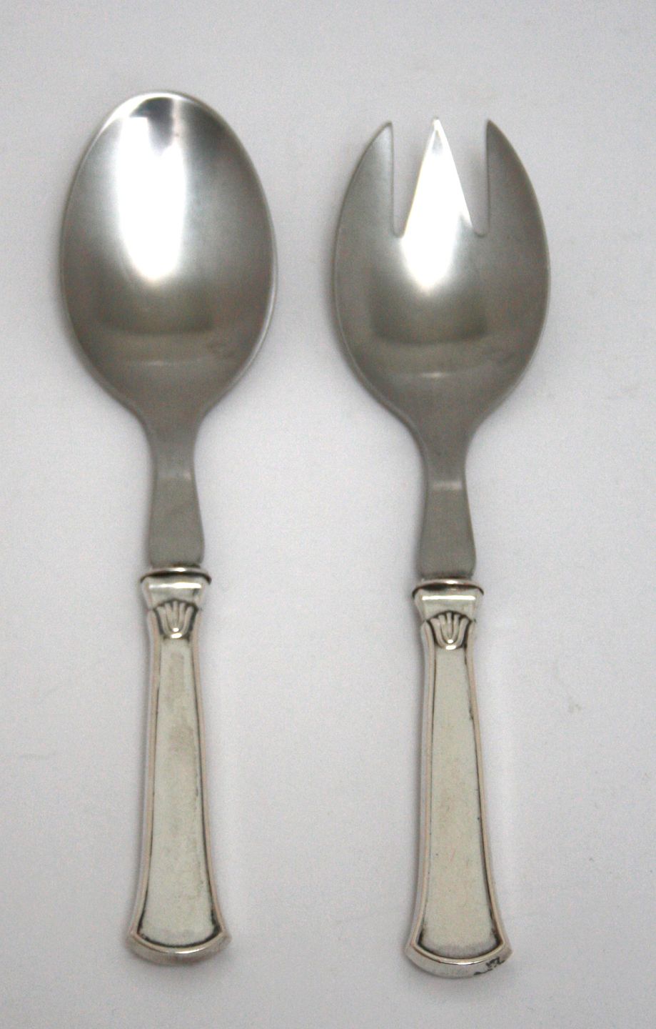 Arvesølv nr. 5, Salatbestik. Tretårnet sølv og rustfrit stål. Ske. Længde 17 cm. Gaffel. Længde 16,5 cm. Pris for sættet 650 kr.