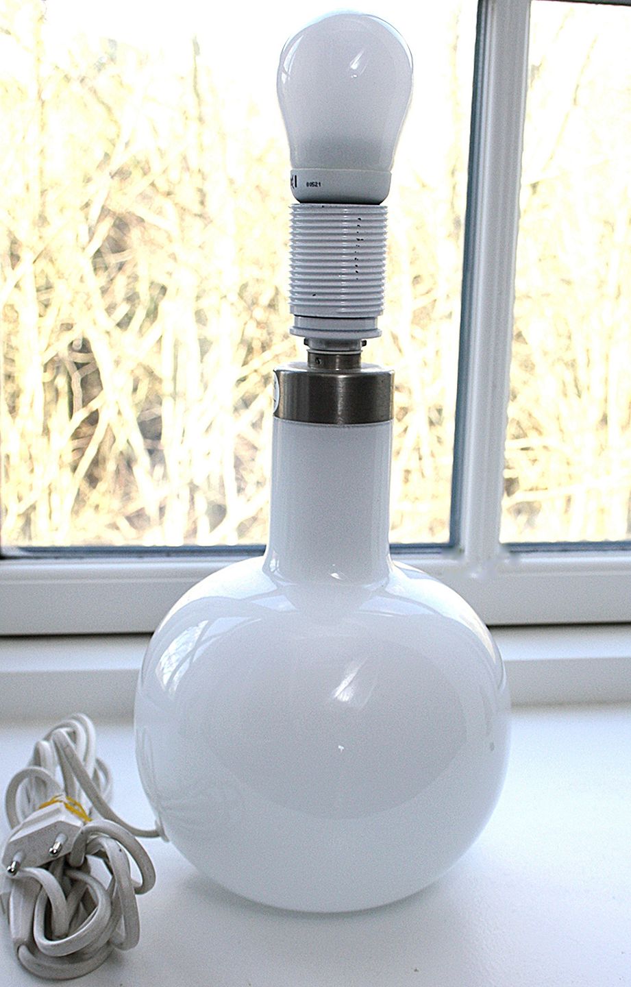 Holmegaard/Fyens glasværk, Boule bordlampe i hvid opal med børstet stål i top. Designet af Michael Bang i 1978. Højde incl. fatning 28,5 cm. Diameter 14 cm. Enkelte ridser. Pris: 475 kr. stk. Lager: 1