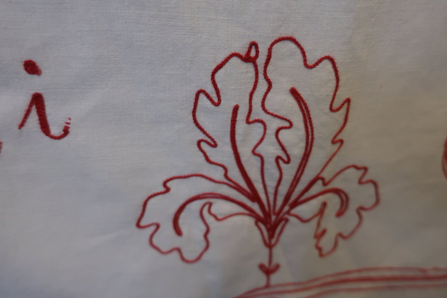 A beautiful old parade piece with handmade red embroidery with the text "Morgenstund har Guld i Mund" (It is the early bird that catches the worm)
