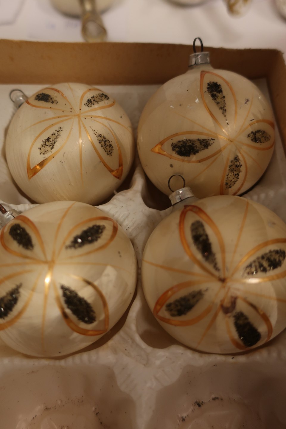 These old Christmas balls are beige colour with gold and black