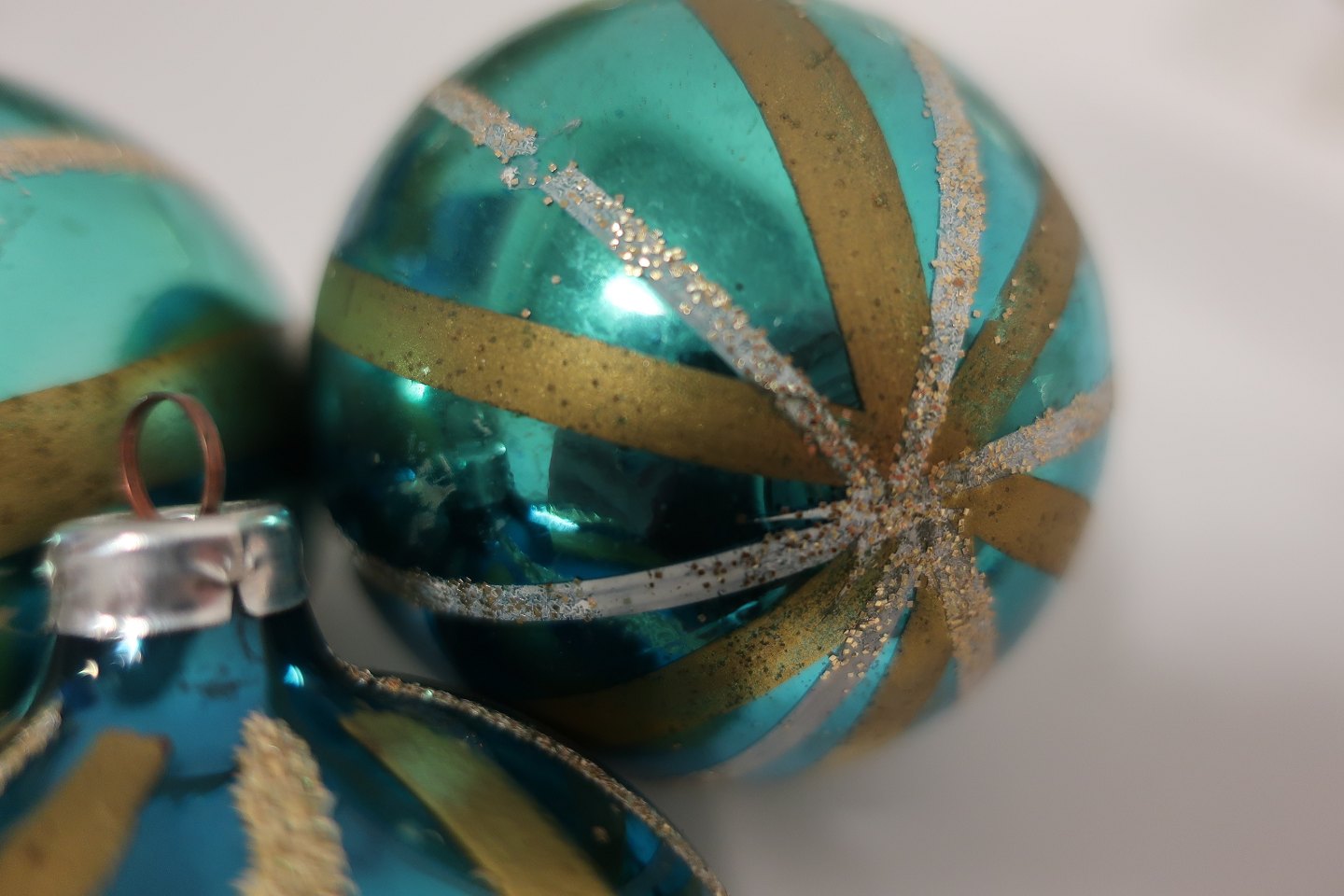 Julekugler af glas Samlet pris for 3 stk. Gamle smukke kugler i blå-/grønfarvede med guld og "sne" God og hel stand Varenr.: 4-020112v