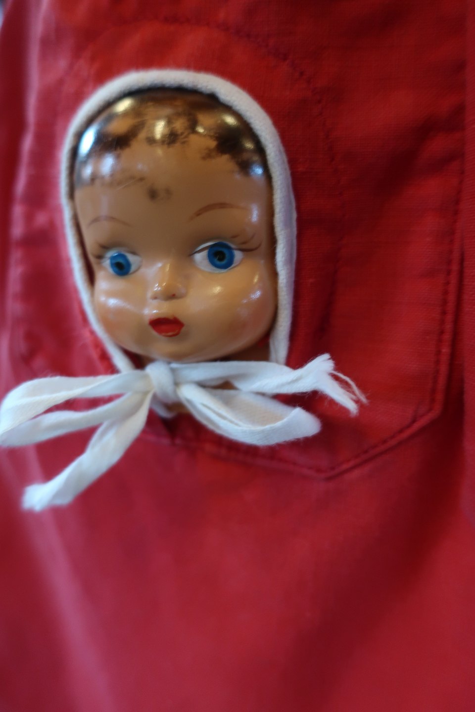 This is a very special pinafore, where a doll face is placed in a cavity/hole at the pocket. It is possible to take the face out/move the face away when the pinafore is to be washed